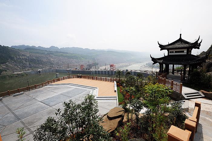据了解,右岸观景平台位于向家坝右岸464米高程云南水富境内,占地面积近8000平方米,与左岸缆机平台隔江呼应,是近距离观赏向家坝工程全貌的最佳位置,平台修建采用中国传统楼宇式建筑风格,亭台楼阁掩映在鲜花绿树丛中,与雄浑的向家坝相映成趣。右岸观景台的修建,为当地居民休闲旅游增添了一处绝佳的景点。