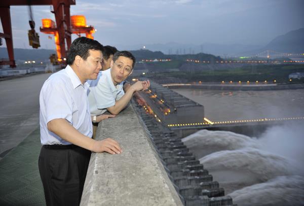 集团公司总经理陈飞(左一)在三峡枢纽管理局局长张曙光等的陪同下检查指导枢纽防汛工作。张爱忠 摄