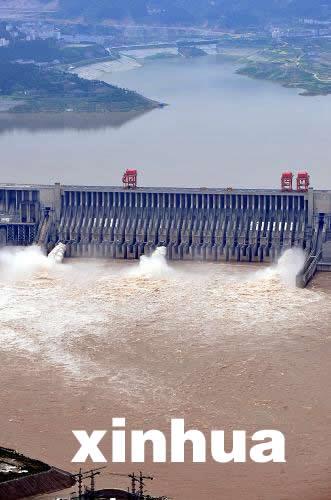 7月17日下午,三峡大坝开启4个泄洪深孔和1个排漂孔,将出库流量由32000立方米/秒增大到34000立方米/秒以下泄洪水。据当地气象部门预报,中国长江三峡集团公司预测未来2-3天内,三峡大坝将迎来一次峰值在65000立方米/秒左右的洪水,堪比1998年长江三峡河段的最高峰值,这也将是三峡水库建成以来所面临的规模最大的一次洪水挑战。为此,三峡正增大出库流量以腾出足够多的防汛库容应对洪水。新华社发(郑家裕 摄)