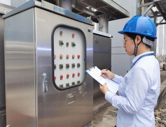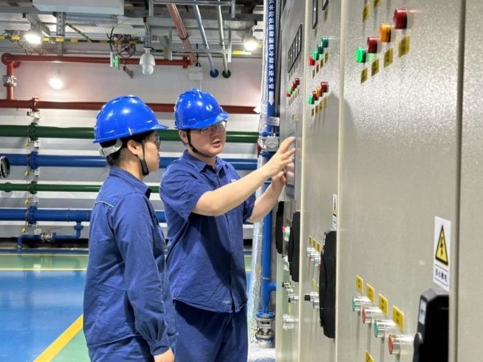 ▲ 江西九江两河地埋式水质净化厂里,三峡集团所属长江环保集团九江水务公司机修班组工作人员正在检查电气设备控制柜运行状态,确保水厂设备设施安全平稳运行,保障水质排放达标。