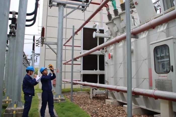 ▲ 三峡集团广东阳江沙扒海上风电场的陆上升压站上,工作人员正在进行输变电设备重点部位测温。
