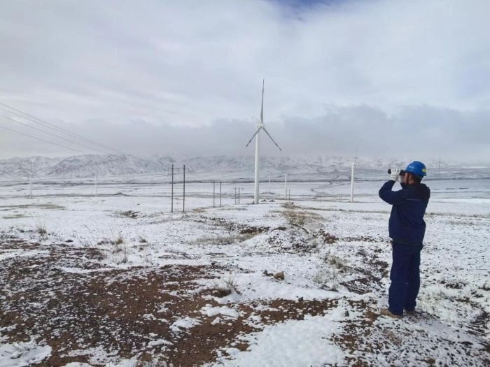 ▲ 国庆佳节期间,甘肃金昌水泉子风电场迎来了降雪。三峡集团所属三峡能源甘肃分公司检修员手持望远镜,仔细观测集电线路、杆塔以及风机叶片的结冰和覆冰情况,确保及时发现并处理潜在的安全隐患。
