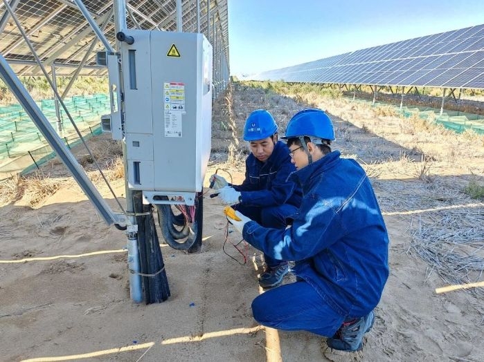 ▲ 在三峡集团所属三峡能源甘肃分公司云华光伏电站里,现场人员正在对逆变器支路电流问题进行排查。