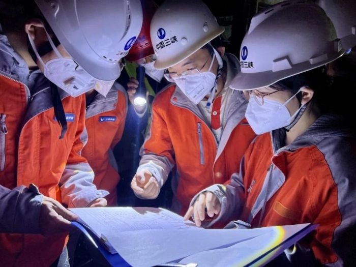 ▲ 在青海格尔木抽蓄项目主变通风洞,三峡集团三峡发展公司武汉分公司格尔木监理部工作人员正在现场分析爆破作业事项与验收要点。