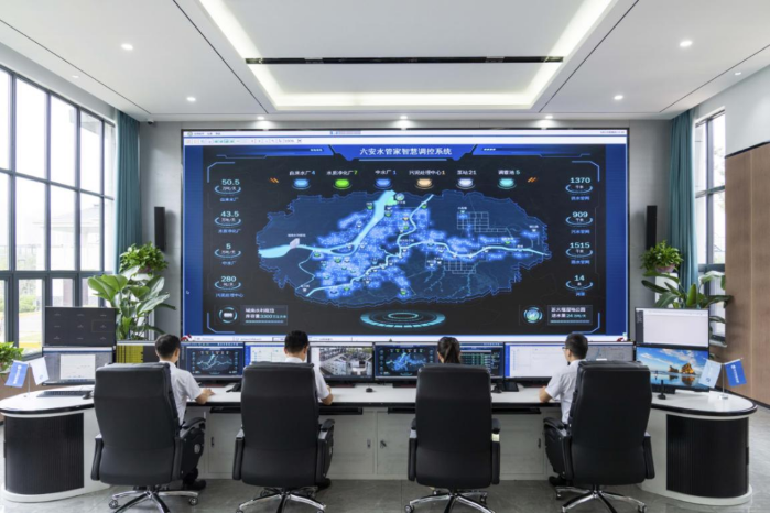 ▲ 在安徽六安,工作人员通过一张数字大屏,全面监控六安主城区管网、自来水厂、污水厂、泵站等所有涉水设施的运转情况,保障城市假期水务的安全平稳运转。