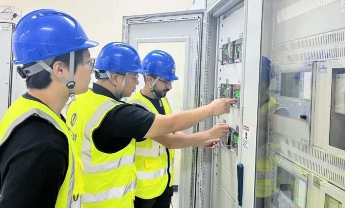 ▲ 在约旦舒巴克(Shobak)风力发电场,三峡集团所属三峡国际三峡亚非公司工作人员在保护装置室查看计量设备,检查设备设施运转情况。