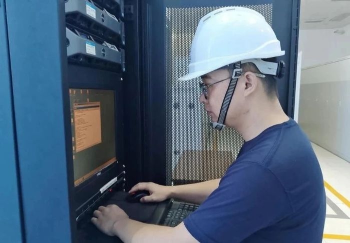 ▲ 在江苏如东海上风电场,三峡集团所属三峡能源江苏运维公司如东(柔直)项目部工作人员正在远程检查海上换流站设备运行情况。