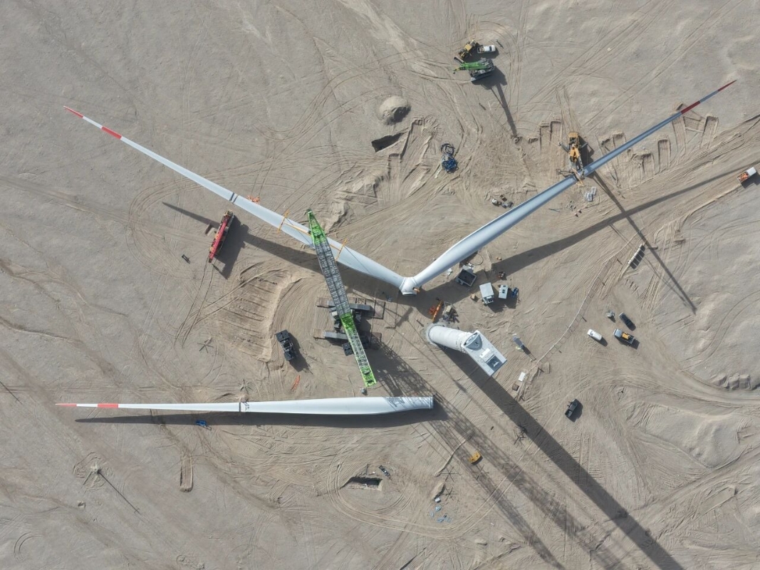 ▲ 风机在建设者手中一步步竖立,扎根无人区,孕育绿色能源。