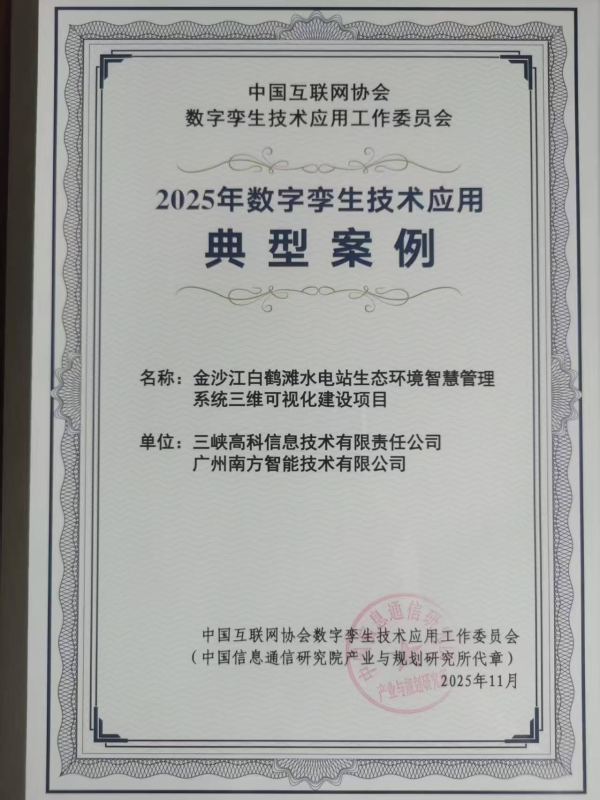 近日,在第二届数字孪生技术与产业发展大会上,三峡高科联合广州南方智能技术有限公司打造的金沙江白鹤滩水电站生态环境智慧管理系统三维可视化建设项目,成功入选“2025年数字孪生技术应用十大典型案例”。
