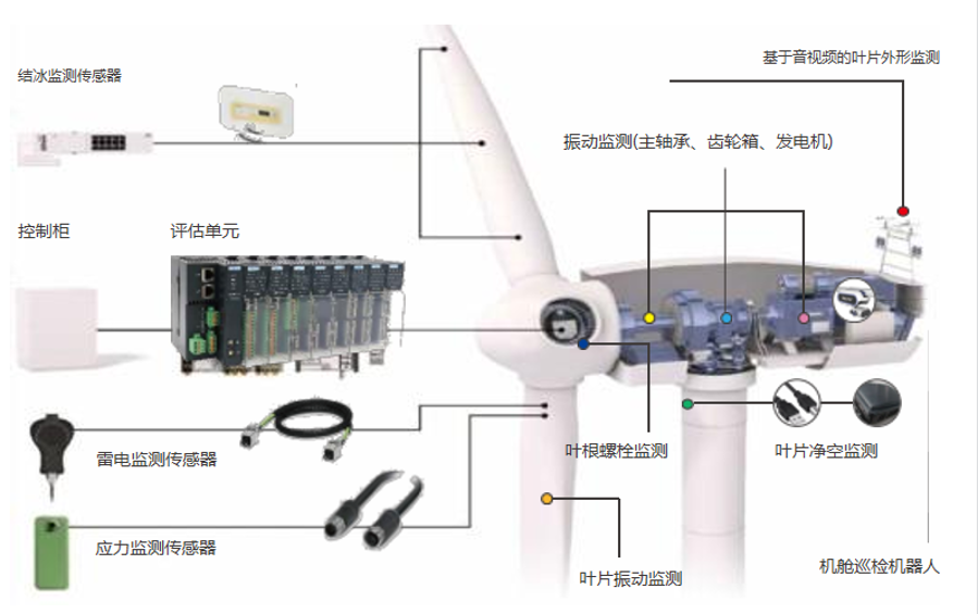 本系列产品可融入主控系统生态,较之传统监测产品,本产品可通过TG100系列可编程智能控制器,实现单机全数据面采集监测,用于监控风力发电机转子叶片的模块化解决方案,带有应力载荷传感器、雷电监测传感器、覆冰监测传感器。利用TG100系列控制器,对应力传感器采集到的实时数据进行预处理。雷电传感器数据通过光学雷电评估单元后进入控制平台处理,结冰传感器数据通过无线方式传入控制柜。传感器数据通过相关数据采集IO模块后进入控制平台处理。控制器和模块安装在独立的控制柜中,安装在轮毂内。